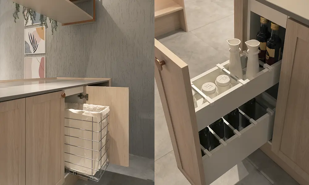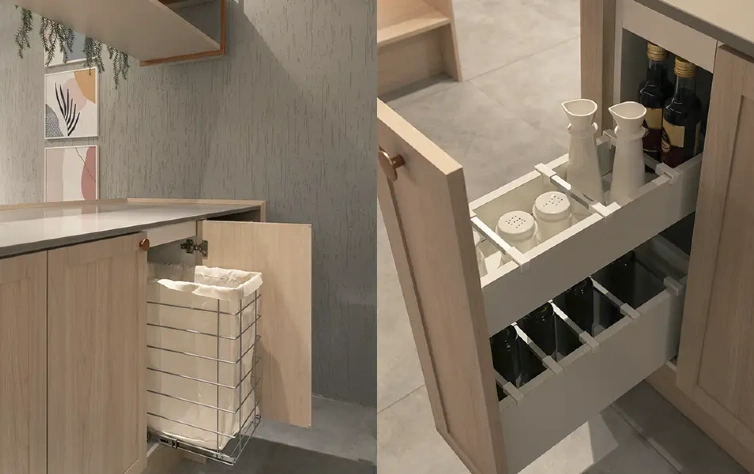 Além disso, as ferragens de qualidade, como dobradiças com amortecimento e corrediças de deslizamento suave, tornam o uso contínuo mais agradável, silencioso e durável.