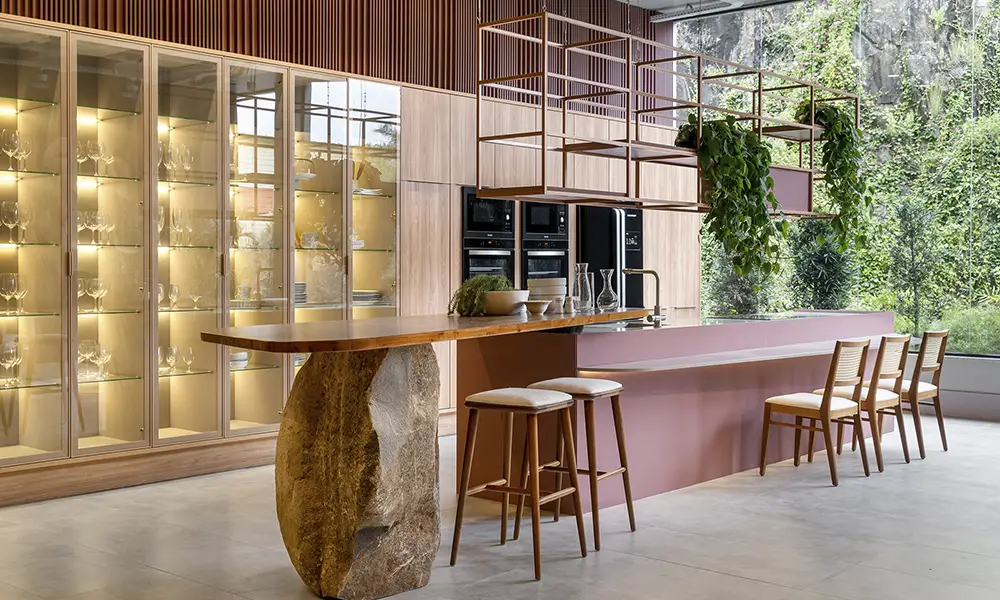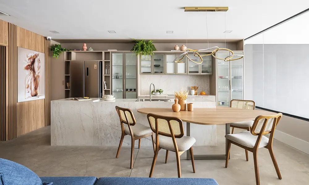 As cozinhas seguem cada vez mais abertas e integradas a outros ambientes da casa. Bancadas multifuncionais, ilhas e projetos que favorecem a circulação reforçam a ideia de um espaço pensado para reunir, cozinhar, conversar e viver diferentes momentos do dia.