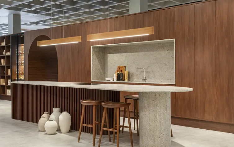 Texturas que remetem à natureza continuam em evidência. Acabamentos amadeirados, superfícies com toque natural e materiais fáceis de limpar aparecem como escolhas frequentes, equilibrando estética e praticidade. A tendência é optar por soluções duráveis, pensadas para o uso diário, com menos excessos visuais.